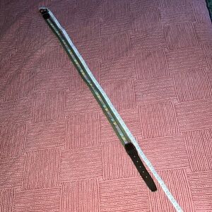 Good used condition, made in England, genuine leather and cotton canvas. Buckle is gold toned metal.