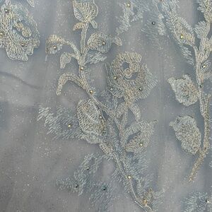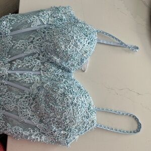 Beautiful light blue evening gown/prom dress embellished with rhinestones and pearls. Worn once for a photo shoot.