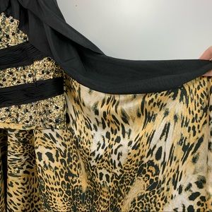 Women’s Jovani dress. Size 4 - see measurements below. In very good used condition. Mini dress with long train. Train comes with wrist strap for holding it up. Animal print mini dress with black plated strips and fully sequinned. Train is black with animal print underlay and rounded at bottom.