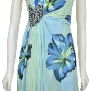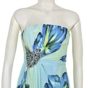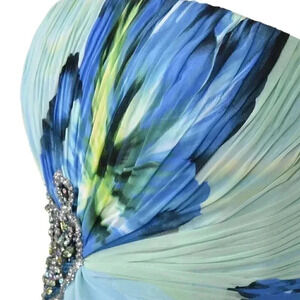 Jovani Formal Gown Blue Green Floral Watercolor Beaded Strapless Chiffon Prom Grad
