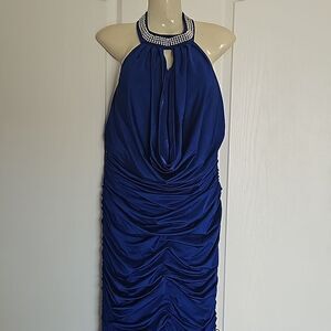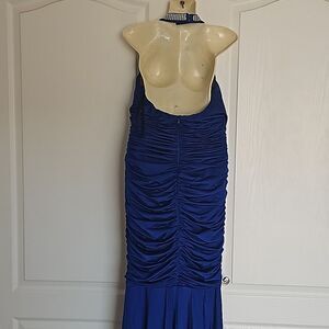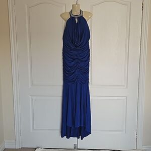 Jovani Rushed Halter Neckline With Faux Pearl Maxi Dress With Side Slit 12 Blue