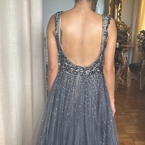 This stunning Jovani dress features a deep V-neckline with sheer illusion details and exquisite silver sequin and bead embellishments that create a glamorous, sparkling effect. The fitted bodice flows into a floor-length A-line tulle skirt, giving it both elegance and comfort.