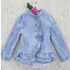Joyfolie size 7 Faded Jean Jacket Elevate your child’s style with this chic blue ruffled jacket. Perfect for any occasion! Very good condition