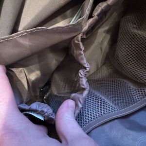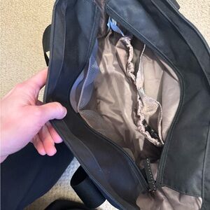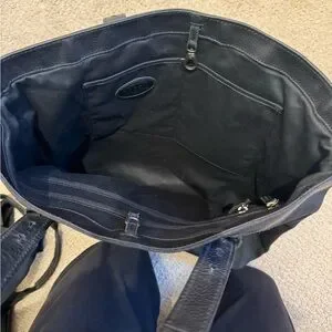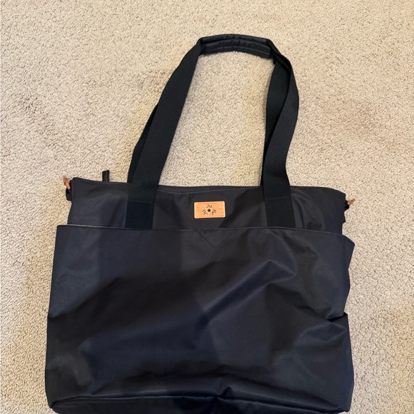 Stylish black tote bag with a logo patch. Features sturdy handles and spacious interior. Diaper bag