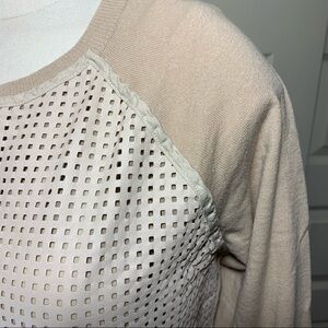 In Great Condition, very good material, gently used, well made, front is a mesh leather, sleeves back and hems are cotton and cashmere. Color Cream/Tan Please see pictures.