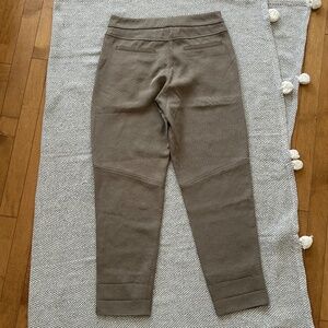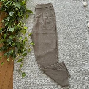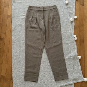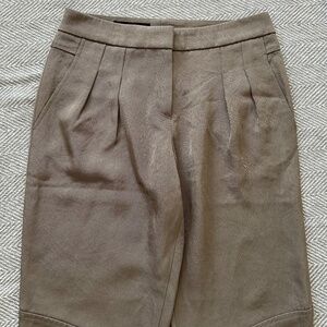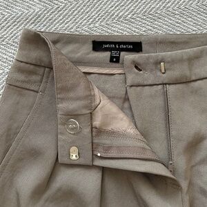 Judith & Charles trousers, size 0. Beige / kaki colour. Pleated waist. Hook-and-bar with zip closure. Ankle length. Welt back pockets. Glossy and heavy fabric; 100% triacetate. Dry clean only. Made in Canada.