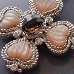 Judith RIPKA 925 Sterling Silver Heart Cross Enhancer Pendant. This piece is super bright and in overall EXCELLENT condition. This ornate and highly detailed design features Pink Mother of Pearl and Smoky Quartz gemstones surrounded with brilliant CZ accents and a large, enhancer style bale. It really shows nicely with a total length of 1 7/8 and it has the appropriate Judith Ripka and 925 silver hallmarks.