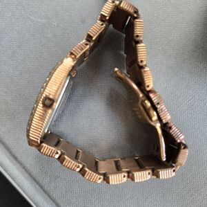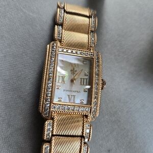 Beautiful Judith Ripka stainless steel Gold Plate cubic zirconia watch. The watch is about 8 inch long and about 1 inch wide (face) . Very good condition.