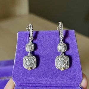 Elegant designer drop earrings by Judith Ripka, crafted in sterling silver with 18K yellow gold accents. Posts and the heart accents are 18k yellow gold. Timeless and versatile — perfect for special occasions or adding luxury to everyday wear.