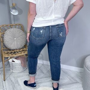 It will feel like you borrowed your boyfriend's jeans right out of his own closet. These high-rise distressed boyfriend jeans are unbelievably comfortable with a nice stretch from the waist down. You will never want to take them off.