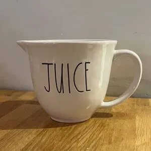 Charming Rae Dunn pitcher with 'Juice' text. Perfect for serving beverages.