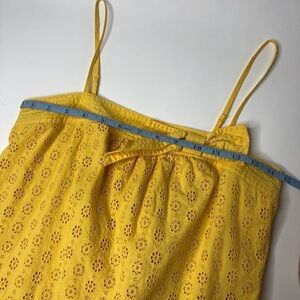 Juicy Couture Y2K 90s sunflower yellow eyelet daisy floral lace tank top with adjustable spaghetti straps. Beautiful bow detail on the front with a girly and flirty ruffle hem bottom. Lined inside with 55% silk and smocked stretchy back between the straps. Super cute 90s throwback look for the summer with some jean shorts. In excellent used condition with no flaws. Please see photos for measurements and details. Women's size 4.