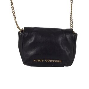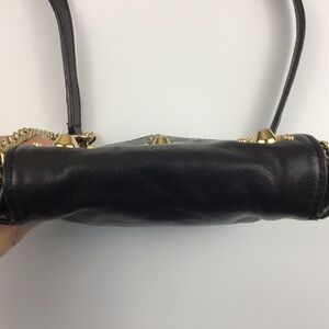 Stylish small black leather crossbody bag with gold studded accents, black fabric lining and a flap with magnetic closure.