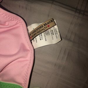 Juicy Couture bikini - never worn. The top is a size medium and the bottoms are a size large. Light pink with green and white accents. “JUICY” written across the bum.