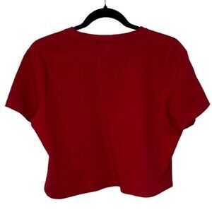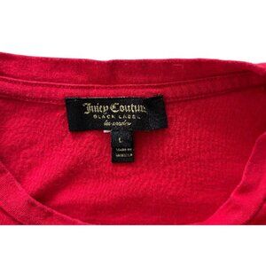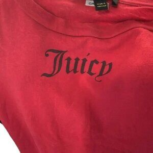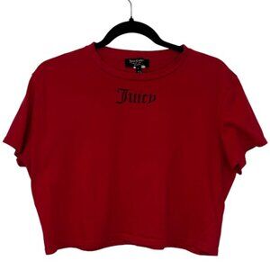 A Juicy Couture red crop top with short sleeves, featuring the brand's iconic "Juicy" script logo across the chest. This top embodies the early 2000s (Y2K) fashion trend, known for its playful and glamorous feel. The cropped length is a key element, designed to be paired with high-waisted bottoms like jeans, skirts, or shorts, creating a balanced and trendy look.