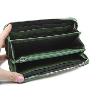 This Juicy Couture Leather Leopard Print Wallet is a stylish accessory that will add a touch of boldness to your outfit. The zip-around design ensures security for your belongings while the leopard/animal print with green trim exudes a fierce yet sophisticated vibe. The silver hardware adds a touch of elegance to the overall look. Inside, you will find multiple card slots for easy organization, an interior zipper compartment for coins or small items, and cash slots to keep your bills in place. Additionally, the exterior back zipper provides quick access to frequently used cards or cash, making this wallet both fashionable and functional.