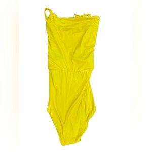 Neon yellow swim dress bathing suit halter style tie up neck removable padding in the breast rouched good stretch available heart jems