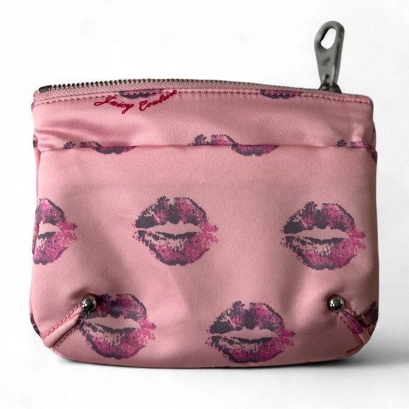 Stylish pink cosmetic bag with lip prints. Features Juicy Couture branding. Ideal for makeup essentials.