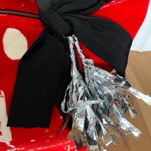 Grosgrain bow and fringe fob with silver shiny tufts (like pom-poms) attached at handle