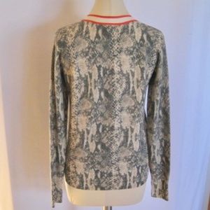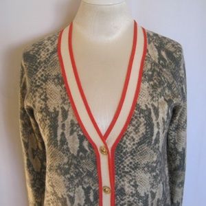 Juicy Couture cardigan. Color: Grey/Orange/Multicolor Python snake skin print. (last photo differs from actual colour.only represents the fit). SIZE: S. (armpit to armpit measures 18") Knit cardigan is designed with a deep v-neck, front button closure, long sleeves.Features a contrasting trim along button placket.Two front patch pockets.Gold tone buttons embossed with JC brand logo. Metal brand initials on left pocket edge, two small side slits. Collarless. Fabric Content:100% Wool. Sweater is in very good pre-owned condition. Minor overall wear. No stains, rips or pilling.