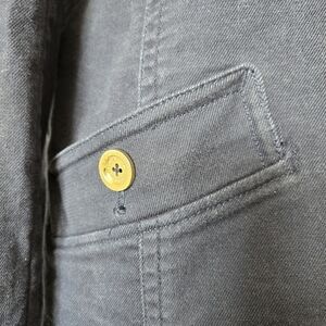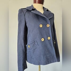 Adorable midweight peacoat with branded gold button closure. Slightly puffed shoulders. pleated back. Navy and white inner lining.