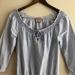 Juicy Couture preppy Y2K style striped stripe print 3/4 sleeve 100% cotton long length peplum shape tunic shirt top blouse with flattering elastic and fully lined. Blue and white in colour. Size S / small. Great gently pre loved condition / EUC. Approx measurements armpit to armpit: 16“ length 33“ sleeve: 19.5“ Offers welcome. Ships in 1-2 business days.