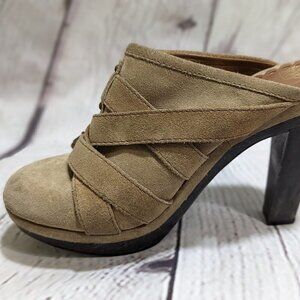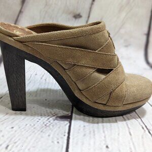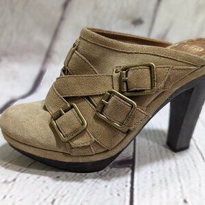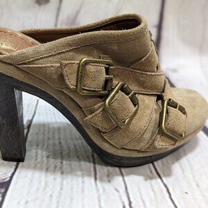 Juicy Couture Y2K Suede Mule Boots Heels Tan Buckle Platform Sz 6