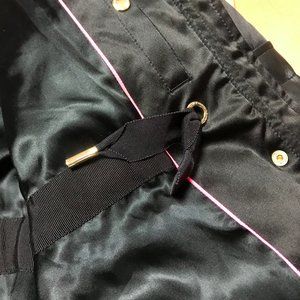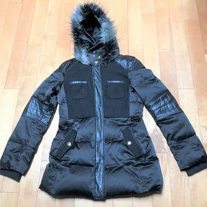 Gorgeous jacket, very flattering on. Inside of the coat has option to cinch waist further. Faux fur hood detail.