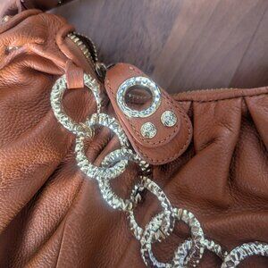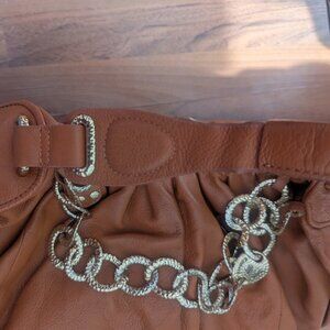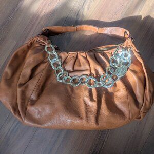 it's a big hobo made of genuine leather colored orange-brown, super well crafted & sturdy, and in excellent condition. the chain and hardware is chunky gold-colored with a hammered finish, and the zipper handle is nice and chunky in leather as well. the chain and hardware look silver in the pics but they're a light gold irl