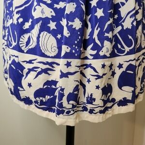 Contrast sleeve and v-neck collar, pleated skirt, lined underskirt, seashells, birds, stars, anchors & pirate ships, Excellent Like New Condition, Size 0 (fits a size up 2/S), Pit-18, Waist-14.5, Sleeve-20, Length-33, no stretch.