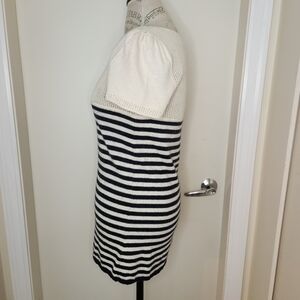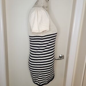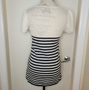 Cream and navy blue stripe short sleeve sweater top with plunging scoop neckline and matching cream & gold buttons up the front, by Juicy Couture.