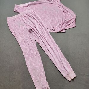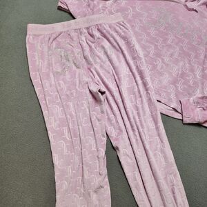 Cozy pink pajama set with Juicy Couture logo. Soft fabric. Perfect for lounging.