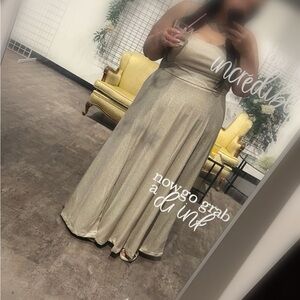 Wore this once for a wedding! See last pic for what it looks like on- the dark spots on the dress are just shadows, it’s in great condition. The dress was hemmed to fit my height, I am 5’6 for reference and was not wearing heels. It’s so comfortable and very stretchy! Has padding in the bust that is not removable.