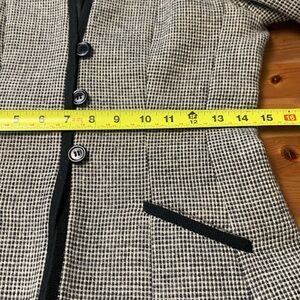 Elevate your office attire with this rare, one of a kind piece from Jules of Montreal. This blazer has distinct styling done in a black-and-white pattern. It has black trim along the front opening and the neckline. Three buttons up the front and two small pockets. Shoulder pads add to the slimming affect.