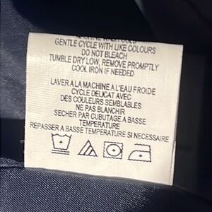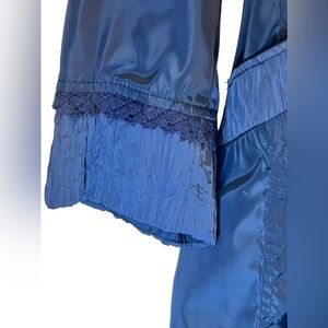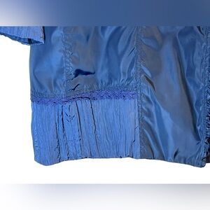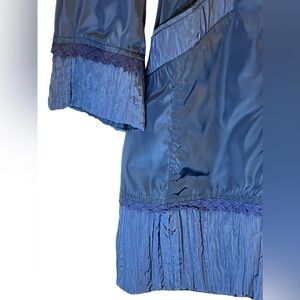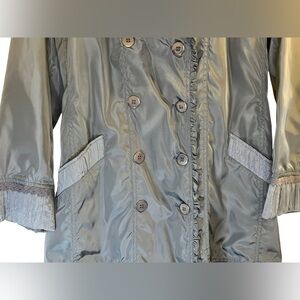 Lightweight navy blue trench coat with belted waist. Cute ruffles trim and double breasted button closure