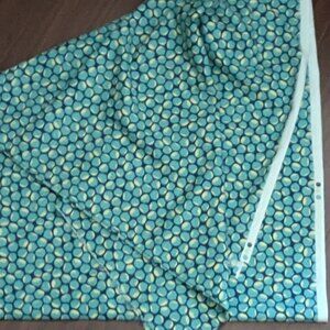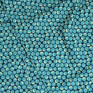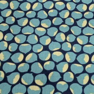 This fabric has a distinctive pattern of irregular round shapes in shades of turquoise and cream on a dark blue background. It is called "Jumble Turquoise" and was designed by Brandon Mably for Kaffe Fassett Collective. It is 100% cotton. Kaffe Fassett is all about colorful and bold prints.