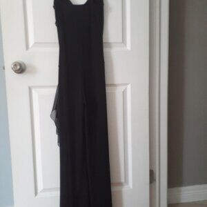 This Jump Suit was used for a semi-formal in the early 2000's. It is a one-piece jumpsuit with a front attached sash. The tags had been cut out but I believe it was bought from Suzy Shier. It has a lot of stretch. It is in used but good condition.