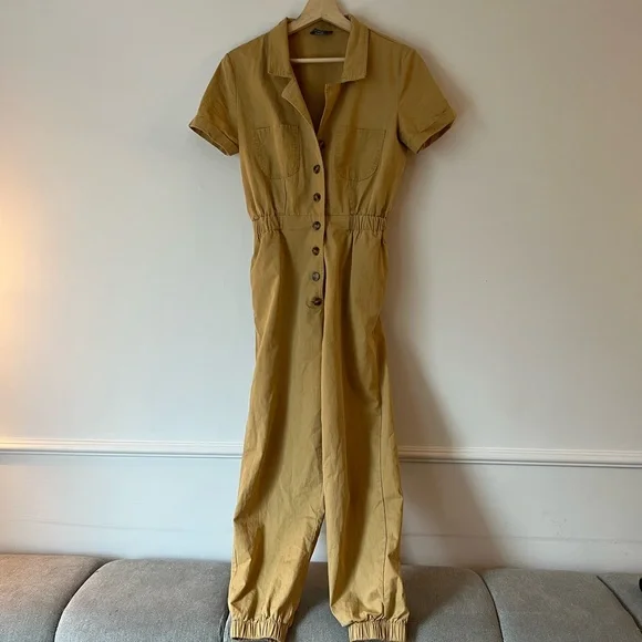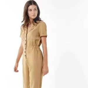 Jumpsuit. Top with collar, v-neckline and tapered waist; high waisted bottom with tapered ankle. Im 5&4 or 162 cm