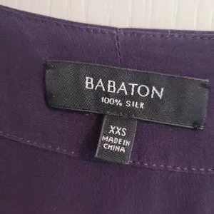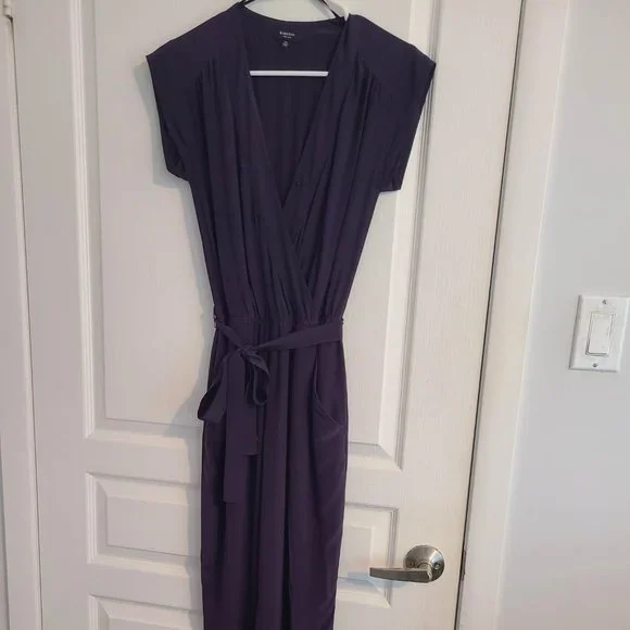 Dark purple jumpsuit from Babaton, size XXS. Wrap bodice. Short-sleeves with pockets and tie at waist. Full length pants, will likely need to be shortened. I am 5'3" and the hem hits the top of my foot.
