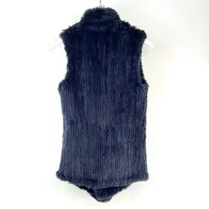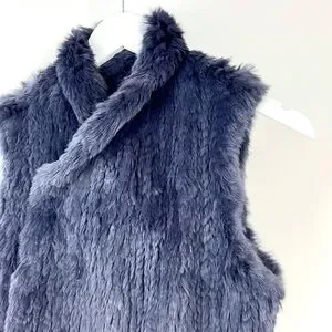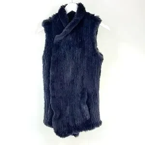 This vest from June is made in a Navy-dyed rabbit fur, and features a sleeveless design, a shawl collar, front snap closures, and front pockets.