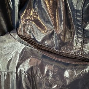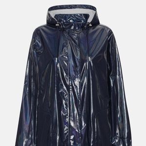 A functional and feminine midi-length raincoat in a glossy, crinkly waterproof PU fabric. This style features a functional detachable hood, adjustable sleeve cuffs, welded seams, and a storm front closure with YKK 2-way zipper. A waterproof rating of 3000 mm will be enough for light showers in an urban setting. Stitched detailing, covered front zip fastener, two horizontal outside pockets with flap over, internal zipped pocket, navy and white striped lining, concealed press stud fastening. Sleeve cuffs have three vertical stud detailing. EU size 42 — fits like US size L. In excellent condition.