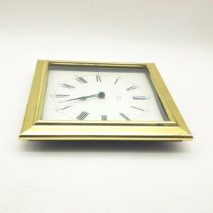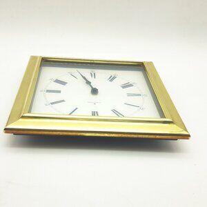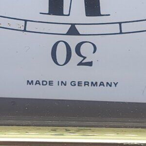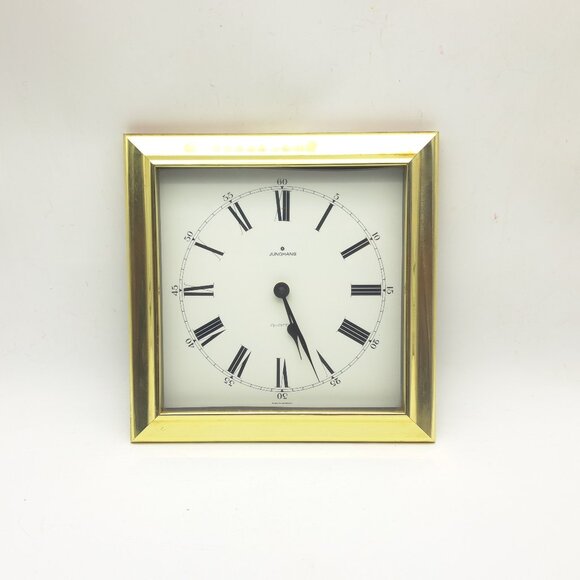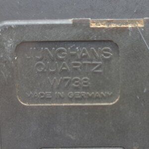 A battery powered clock made in Germany by Junghans, somewhere between 1970, when they introduced the clock, and the 1990s. It is white with a brass colored rim. I ran it for 24 hours and it gained or lost no time. There is nothing on the back to hang it rest it on so it must be leaned against a wall.