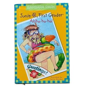 Colorful children's book featuring Junie B. First Grader. Bright yellow cover with playful illustration. Hardcover with book jacket, and page marker.