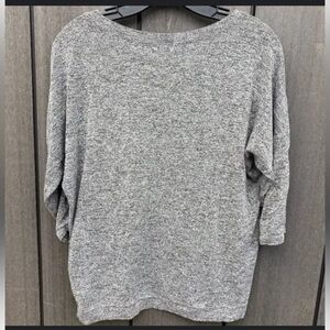 Grey shirt with 3/4 length sleeves, front pockets and zippered shoulder detail. Dropped sleeves