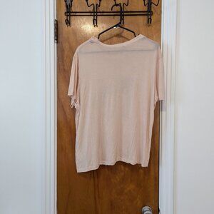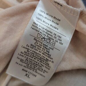 Junk Food Beatles Tissue Tee in size XL. This t-shirt is a peachy beige color, thin and see-through, with a purple and orange Beatles graphic. It got deformed in the wash and the bottom hem is longer on the right side (See pictures). I have to wear it with a knot on the side. Light signs of wear. 100% Micro modal.