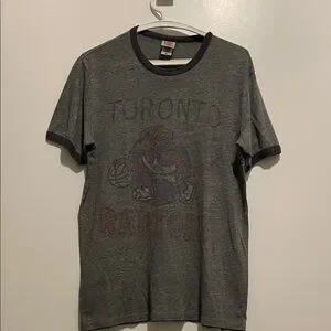 Vintage-style Junk Food tee. Faded Toronto Raptors graphic on front. Contrast dark ringer collar and sleeve trim. Soft heathered gray body. Casual short sleeve design.