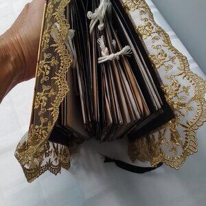 This handmade Junk Journal is filled with writting papers, handmade coffee dyed papers, blank papers, pockets, tags, journaling cards. Stunning images throughout. The cover has a closure, Gold vintage lace and a gorgeous black metal dragon dangle. My journals sell out regularly in my store, at seasonal markets and my pop up sip and shop markets.