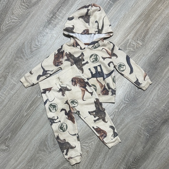 Adorable dinosaur print hoodie and pants set. Perfect for little explorers.