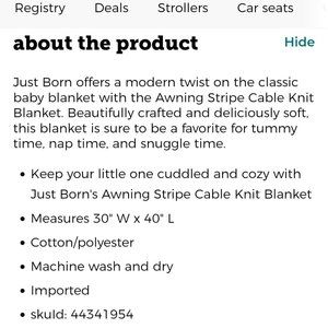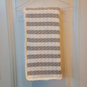 Just Born, NWOT, Awning Stripe Cableknit Blanket, 100% cotton front in a taupe and white Stripe (stock photo says Grey, but this appears to be more of a taupe colour) polyester back. Gorgeous little Blanket!!