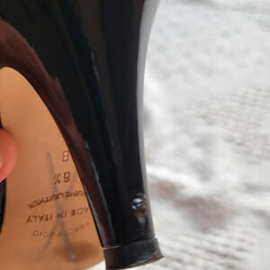 Preowned, in gently used condition. A couple small flaws to note. Some small smudges on gloss and a small snag on lower heel. Sole has some marking. Pictures included.